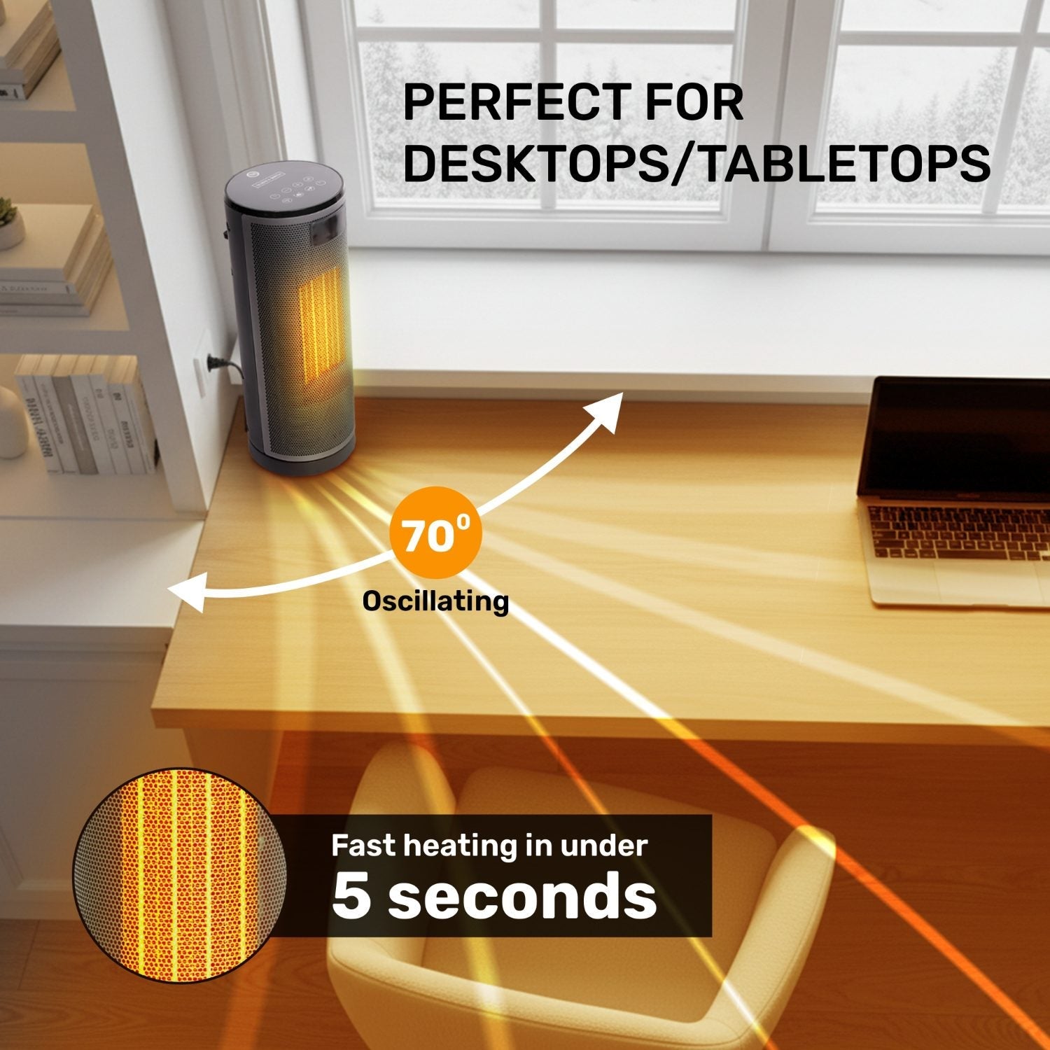 - OSCILLATION + QUIET, FAST CERAMIC HEATING: Enjoy rapid warmth within seconds with advanced PTC ceramic heating, delivering fast and consistent heat. The wide-angle oscillation circulates warm air evenly throughout the room, preventing cold spots. Quiet operation makes it ideal for bedrooms, offices, and living spaces.