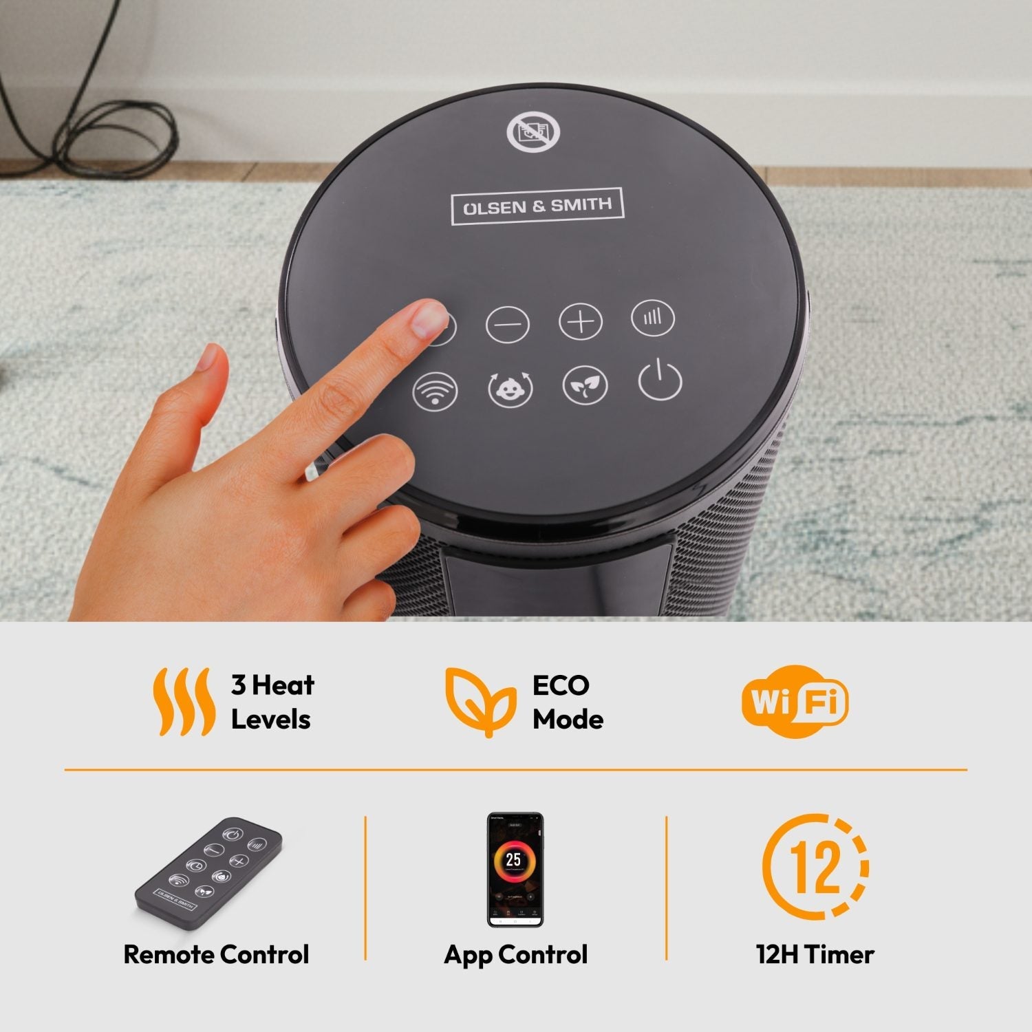 - TOUCH CONTROLS, SMART APP & REMOTE CONTROL: Control your heater using the touch panel, the included remote, or via WiFi using the Tuya Smart App. Adjust temperature, power levels, oscillation, and timer settings from anywhere. Supports Google Home & Alexa for convenient voice-activated heating.