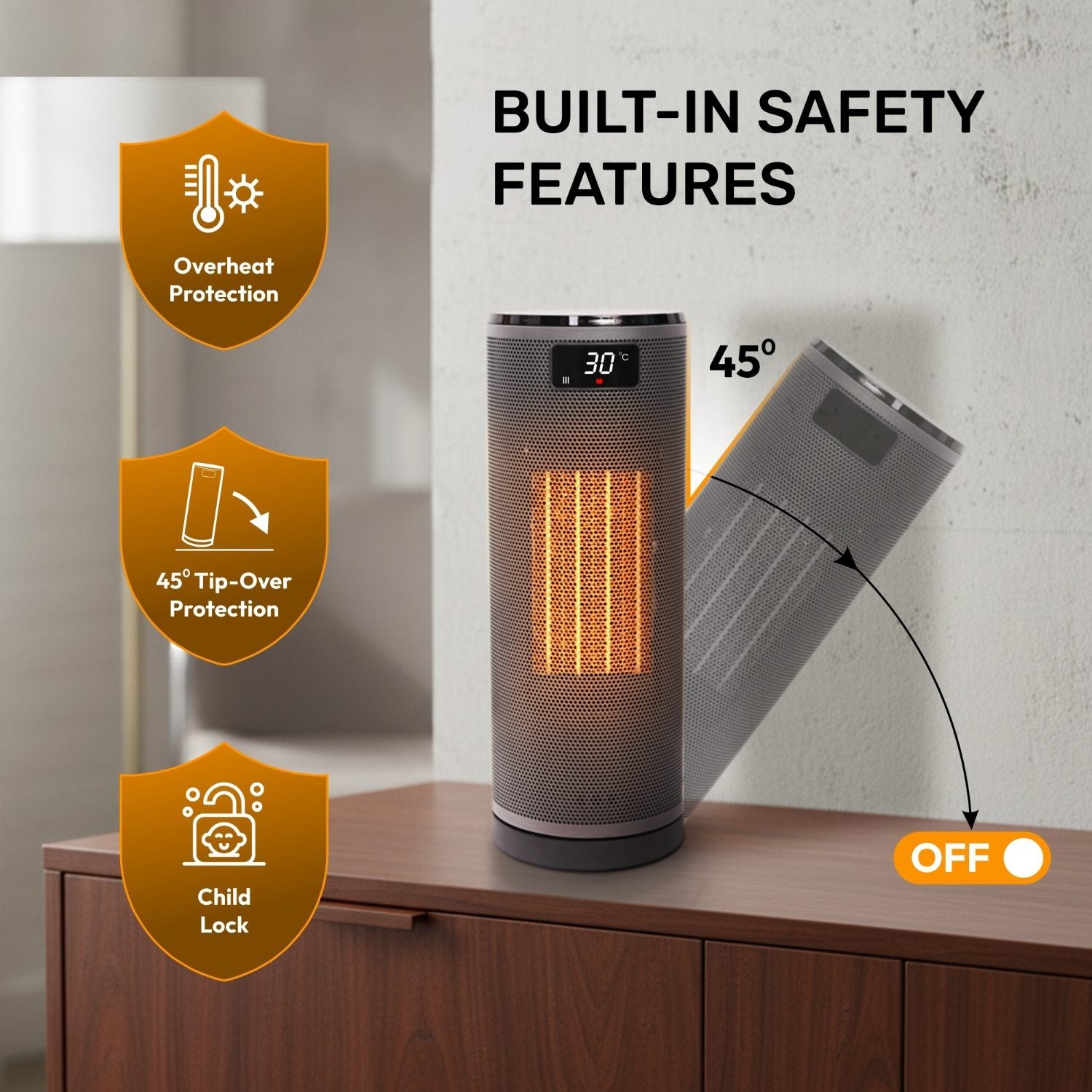 - SAFETY-FOCUSED & ENERGY EFFICIENT: Features tip-over protection, overheat shut-off, child lock, and a programmable timer for safe everyday use. Its compact, modern design is perfect for desks, bedside tables, and rooms up to 20m². Includes a 1.5m power cord, making placement flexible and convenient.