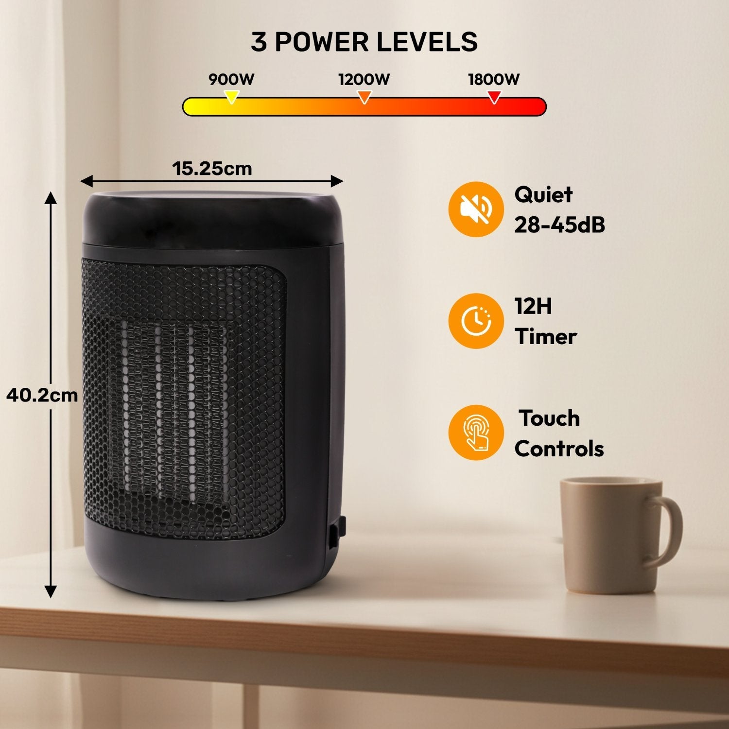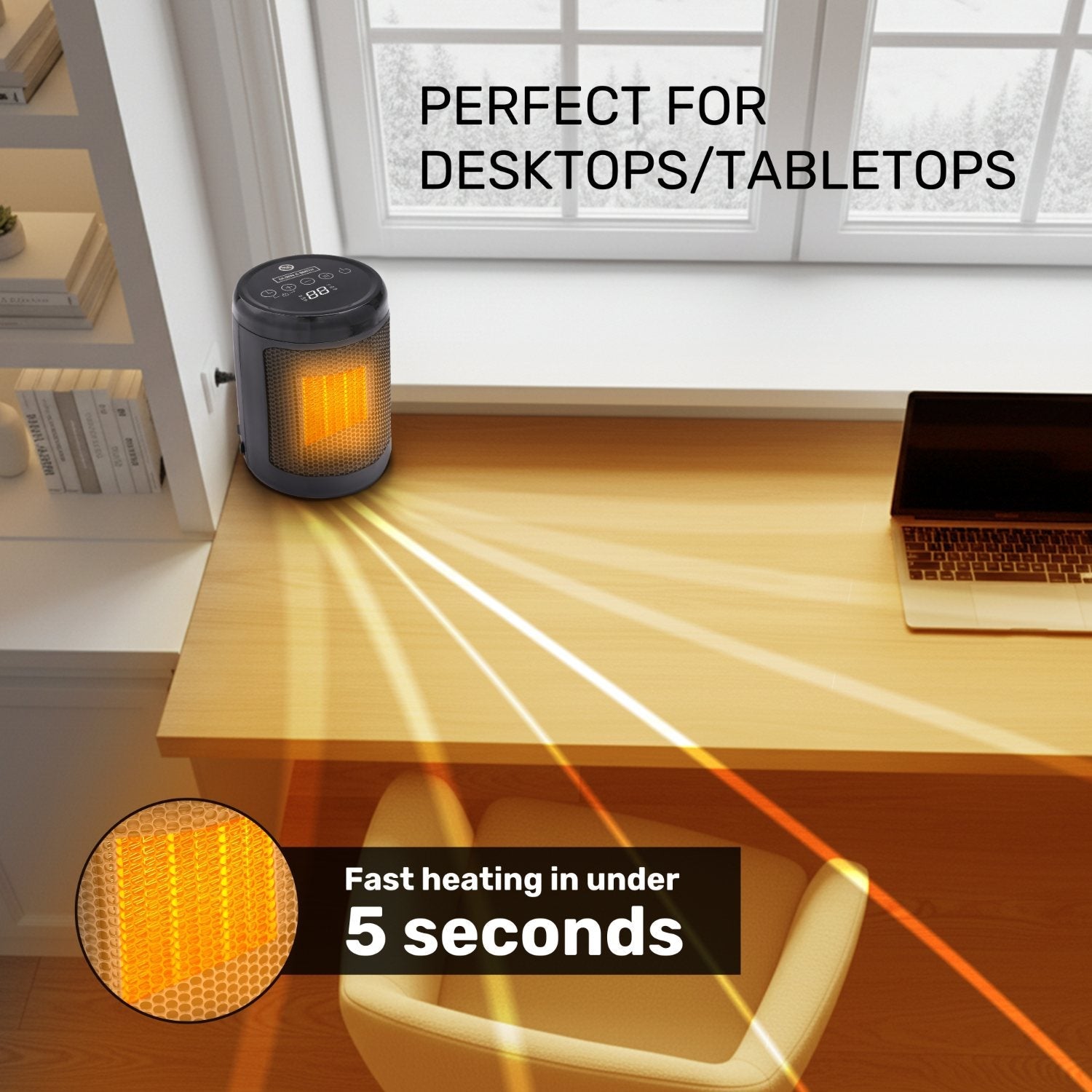- ADVANCED SAFETY FEATURES: Equipped with tip-over protection, overheat shut-off, child lock, and a programmable timer for safe and worry-free operation. Its compact, stable, and modern design makes it perfect for desks, bedside tables, and rooms up to 20m². Comes with a 1.5m power cord for flexible placement.
