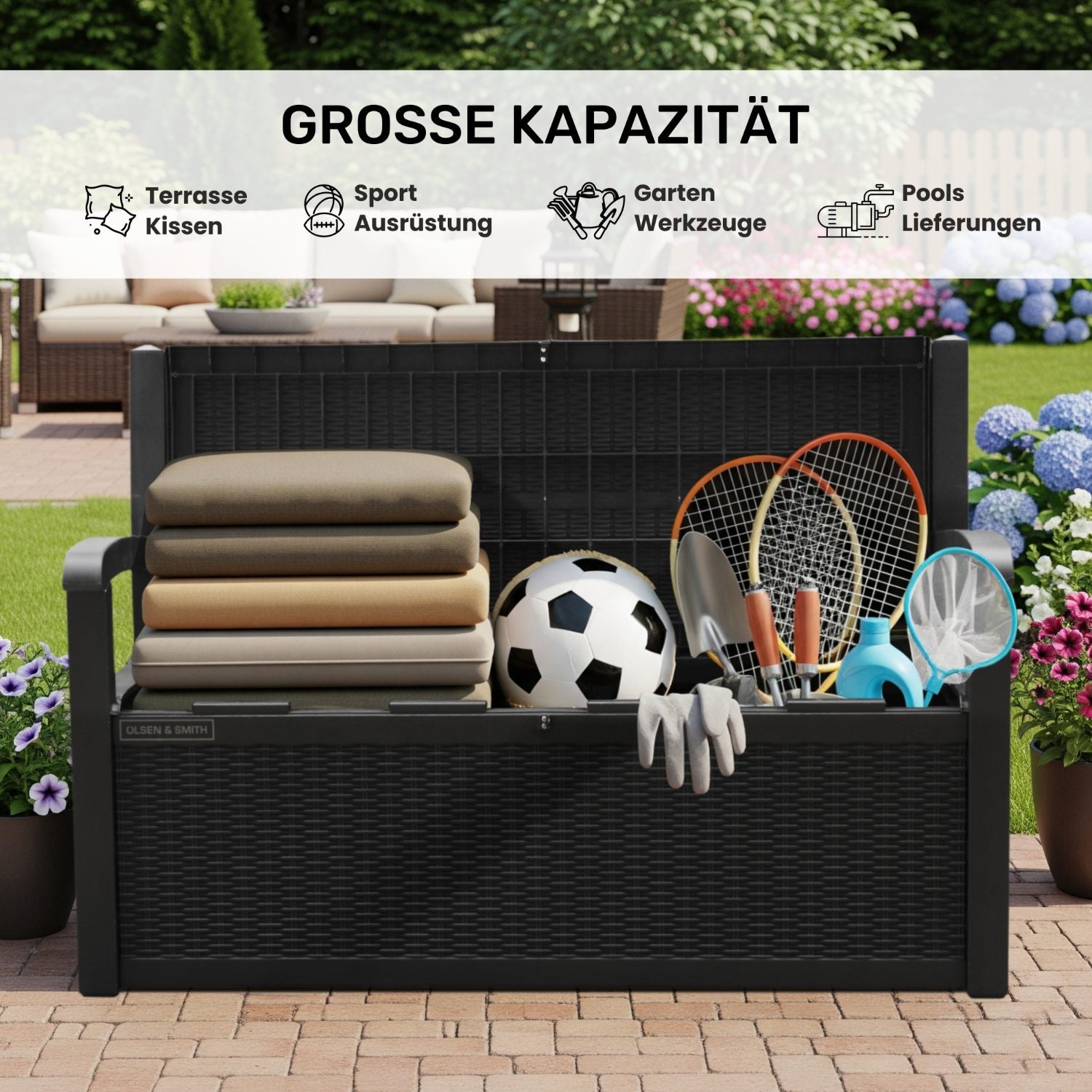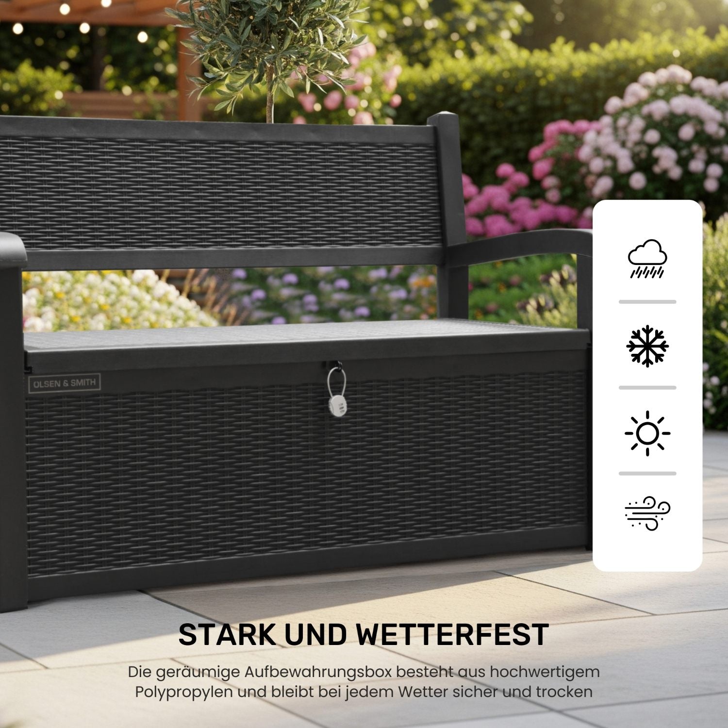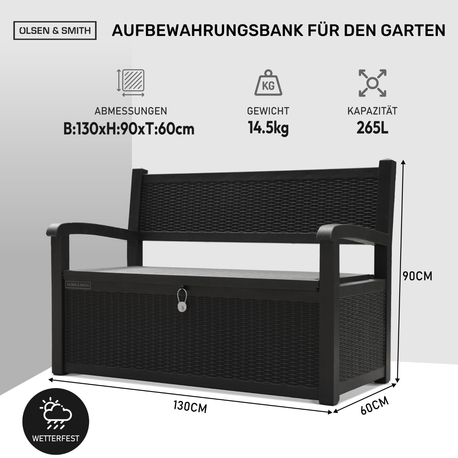 Olsen & Smith 265L Garten-Aufbewahrungsbank für draußen – Wetterfeste Sitzbank aus Kunststoff in Rattanoptik mit abschließbarer Aufbewahrungsbox, Gartenmöbel-Truhe für Werkzeuge, Kissen & Spielzeug – Schwarz