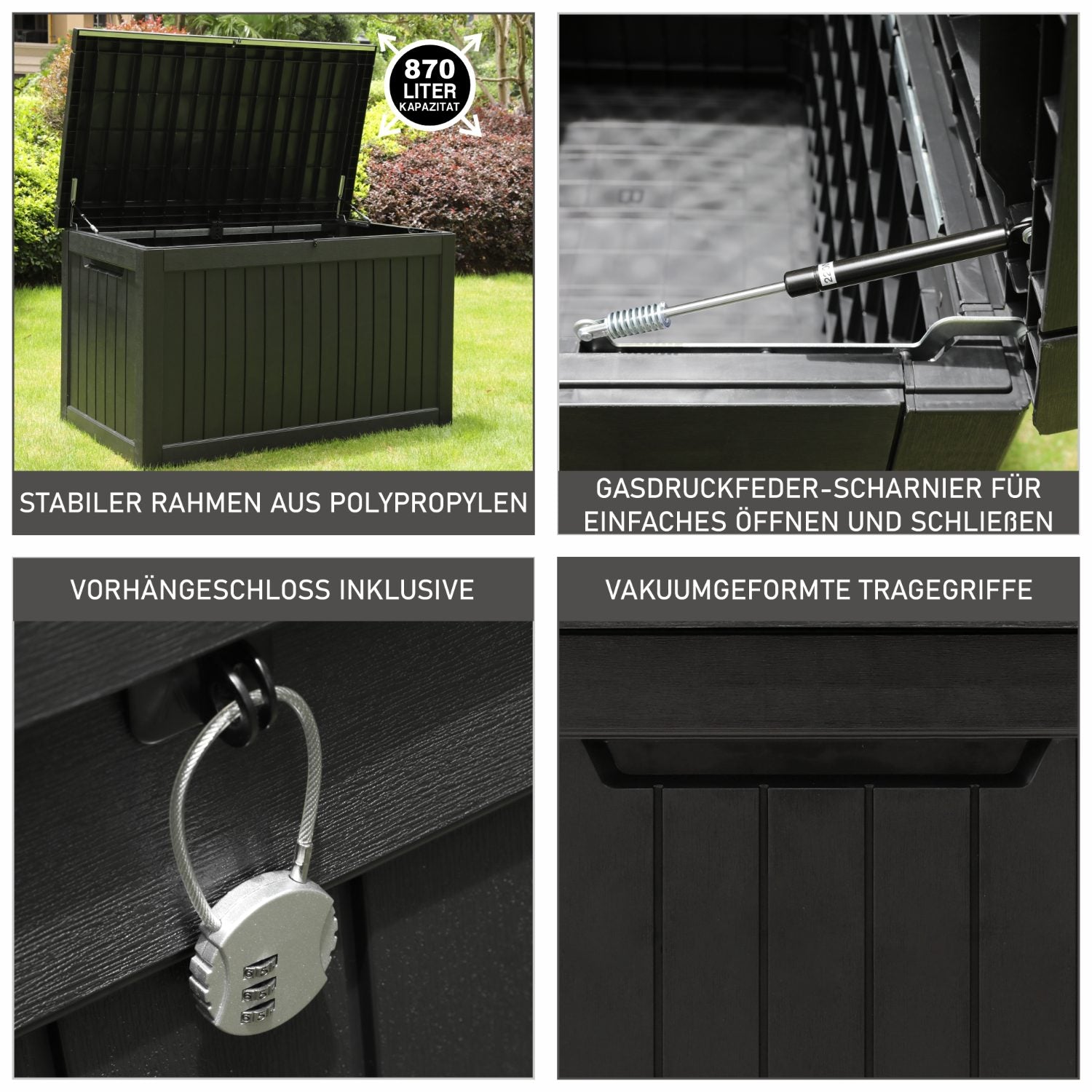 Enormes Fassungsvermögen von 870L für den Außenbereich – Halten Sie Ihren Garten, Ihre Terrasse oder Ihren Balkon ordentlich und organisiert mit dieser extra-großen Aufbewahrungsbox. Perfekt zur Aufbewahrung von Kissen, Möbelbezügen, Gartengeräten, Spielzeug und anderen Outdoor-Utensilien. Maximales Aufbewahrungsgewicht: 30kg.