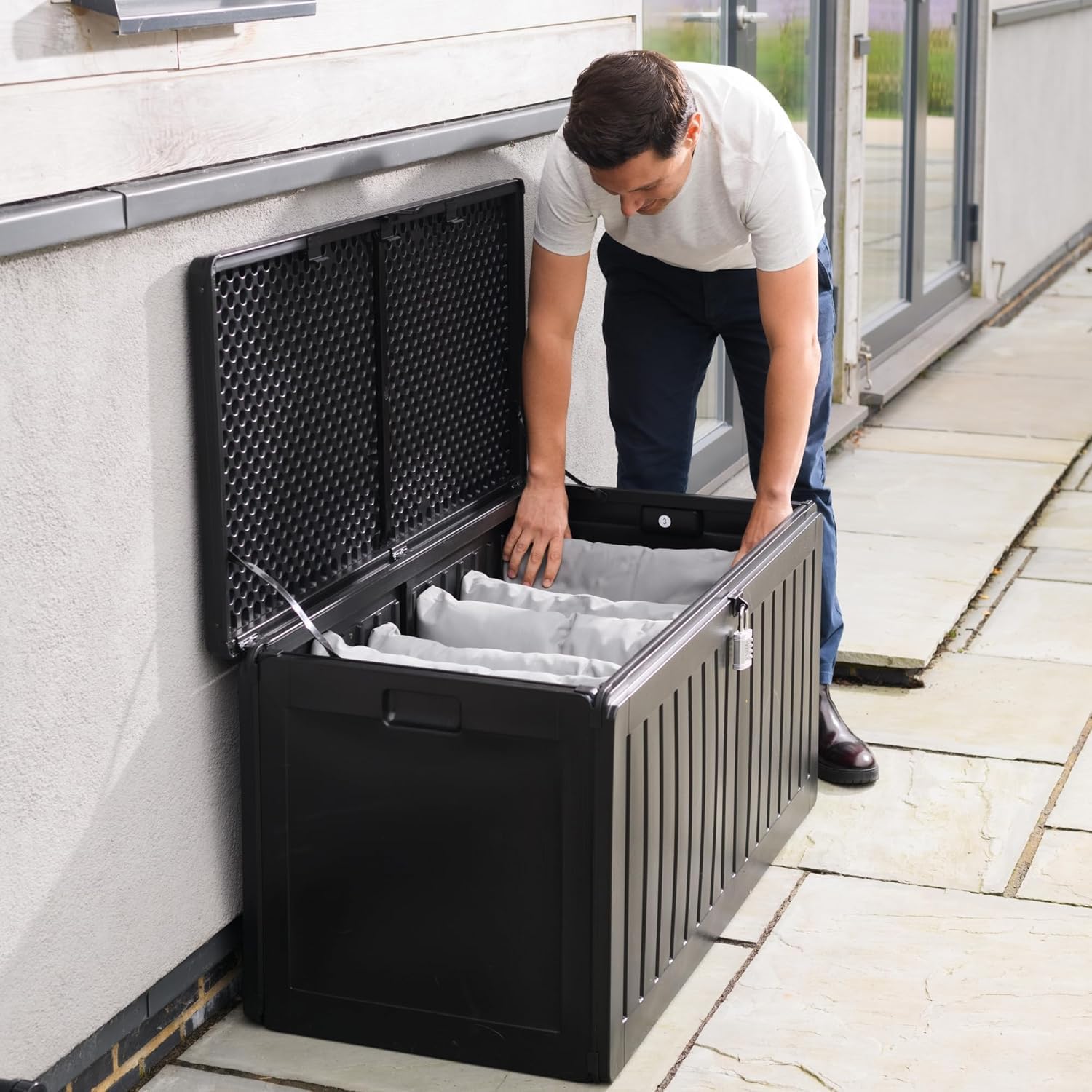 - LEICHT & WETTERBESTÄNDIG: Jede Aufbewahrungsbox besteht aus hochwertigem und dennoch leichtem Polypropylen mit verstärktem Rahmen zum Schutz vor Witterungseinflüssen und Abnutzung. Bitte beachten Sie, dass die Box nicht als Sitzgelegenheit geeignet ist. Nicht für scharfe Gegenstände geeignet.