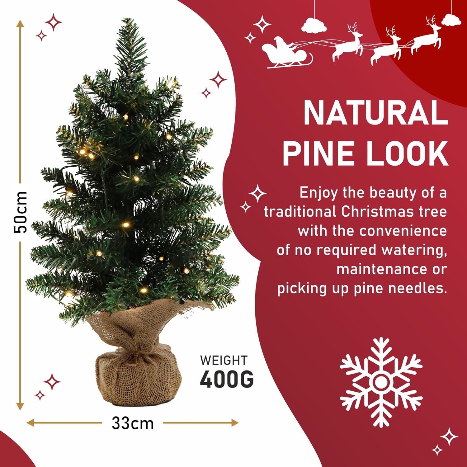 Olsen & Smith 50cm (20in) Pre-Lit Mini Christmas Tree – Battery Operated Artificial Pine Tabletop Xmas Tree with 30 Warm LED Lights, 8 Light Modes & Sack Cloth Base – Perfect for Home, Office & Desk Decoration