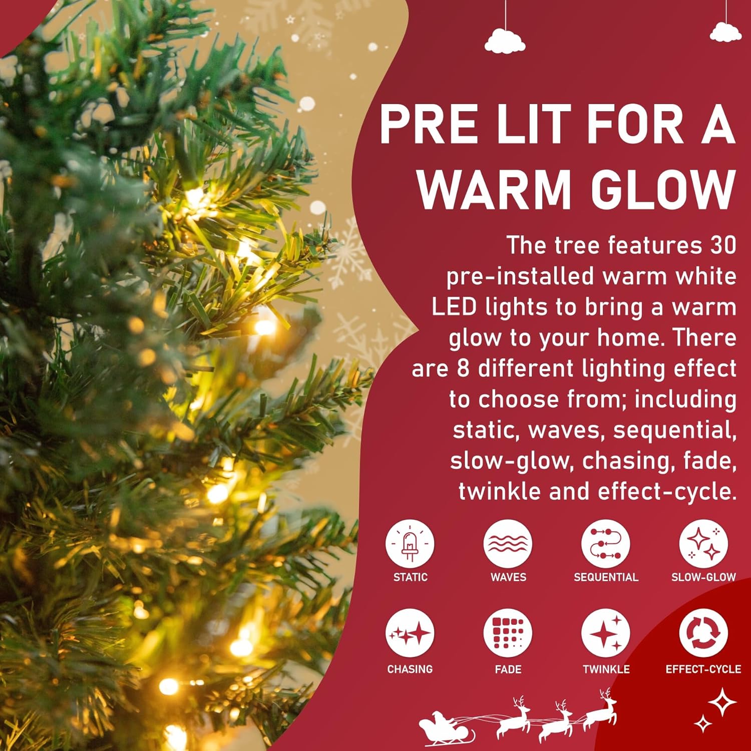 - WARM GLOW WITH 8 LIGHT MODES – Features 30 warm white LED lights for a cosy festive ambiance. Choose from 8 lighting effects – including steady, waves, fade, twinkle and more – to suit your Christmas mood. Battery operated (requires 3×AAA batteries, not included) for flexible placement anywhere.