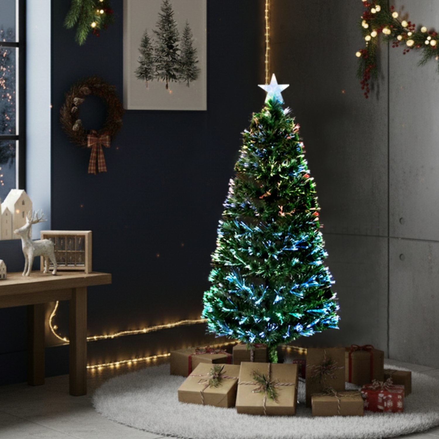 - BUILT-IN STAR TREE TOPPER: Comes complete with a light-up multicoloured star topper, perfectly synced with the fibre optic display. It adds a beautiful finishing touch, making your Christmas tree shine from top to bottom.