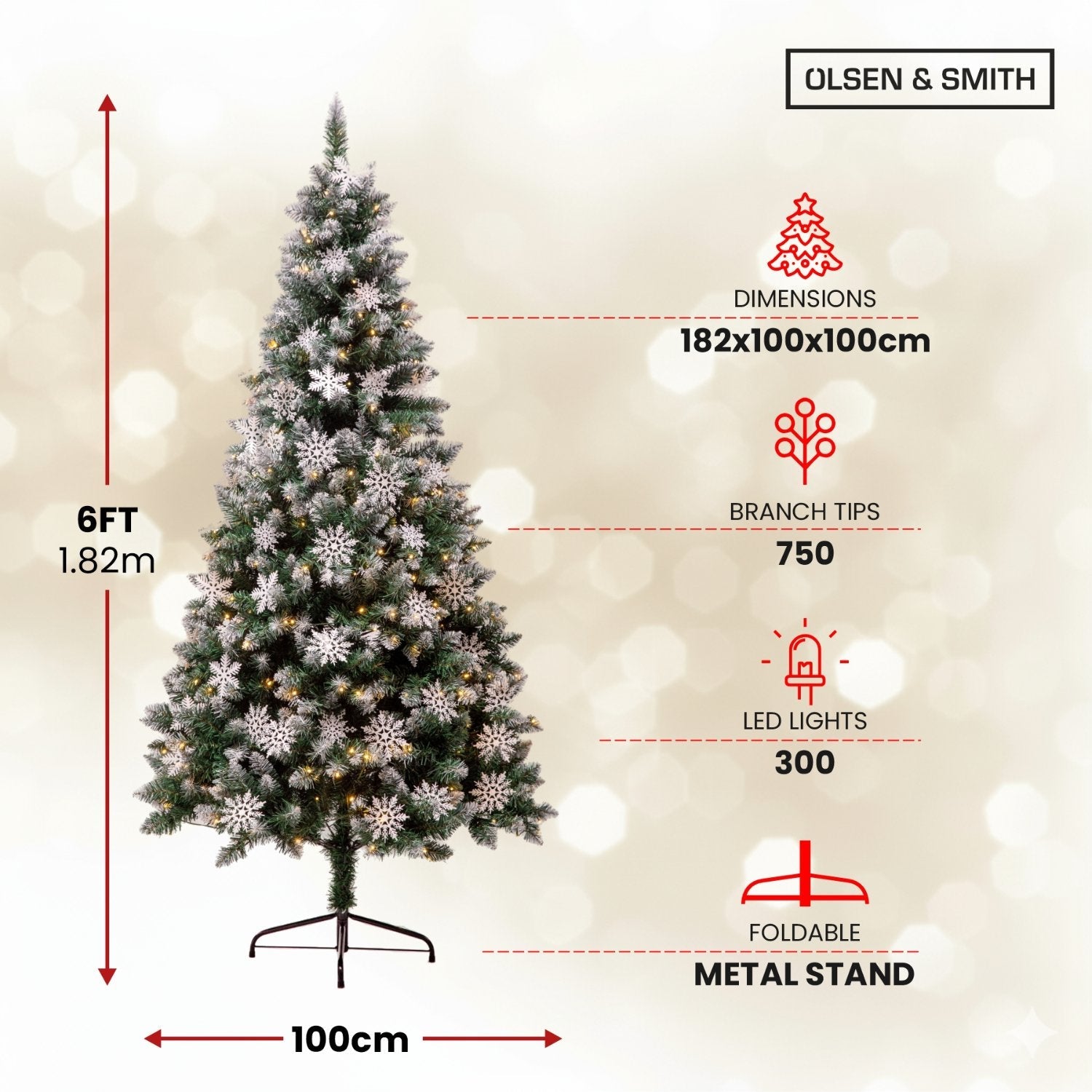 Olsen & Smith 6ft Snowy Pre Lit Christmas Tree – Artificial Indoor Xmas Tree with 300 Warm White LED Lights, Snowflake Ornaments, Frosted Branch Tips & Metal Stand – 750 Branch Tips